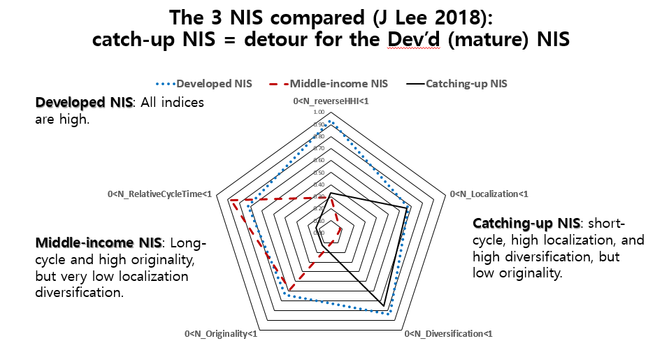 Some scholars believe the reason is about institution. For example, Acemoglu and Robinson proposed the theory of “extractive vs. inclusive institution”. However, the theory relatives more in poor and pre-modern countries, but there is less difference in middle income countries. We confirm that the national innovation system (NIS) plays an important role of catching-up, even determines competitiveness of nations and their economic growth. We also found that countries adopt different growth mechanisms at different stages (from low-income to mid-income and from mid-income to high-income). The key transition variables and policies are taking detours and leapfrogging. They choose detours due to two failures (firm capability and size) and a barrier (intellectual property rights, IPR) in the North. Firm capability failure is intrinsic difficulty of building innovation capabilities in the South. Size failure is lack of big businesses in the South, which are filled with small and middle entrepreneurs (insufficient to be a high income status). We found big firms are really important in catching-up countries and developed countries. IPR in the North, as barrier to catch-up by the South, also referred to the ladder (industrial policy) kicked away. In regression, IPR weakens the level of technology of exporters’ effect on export.