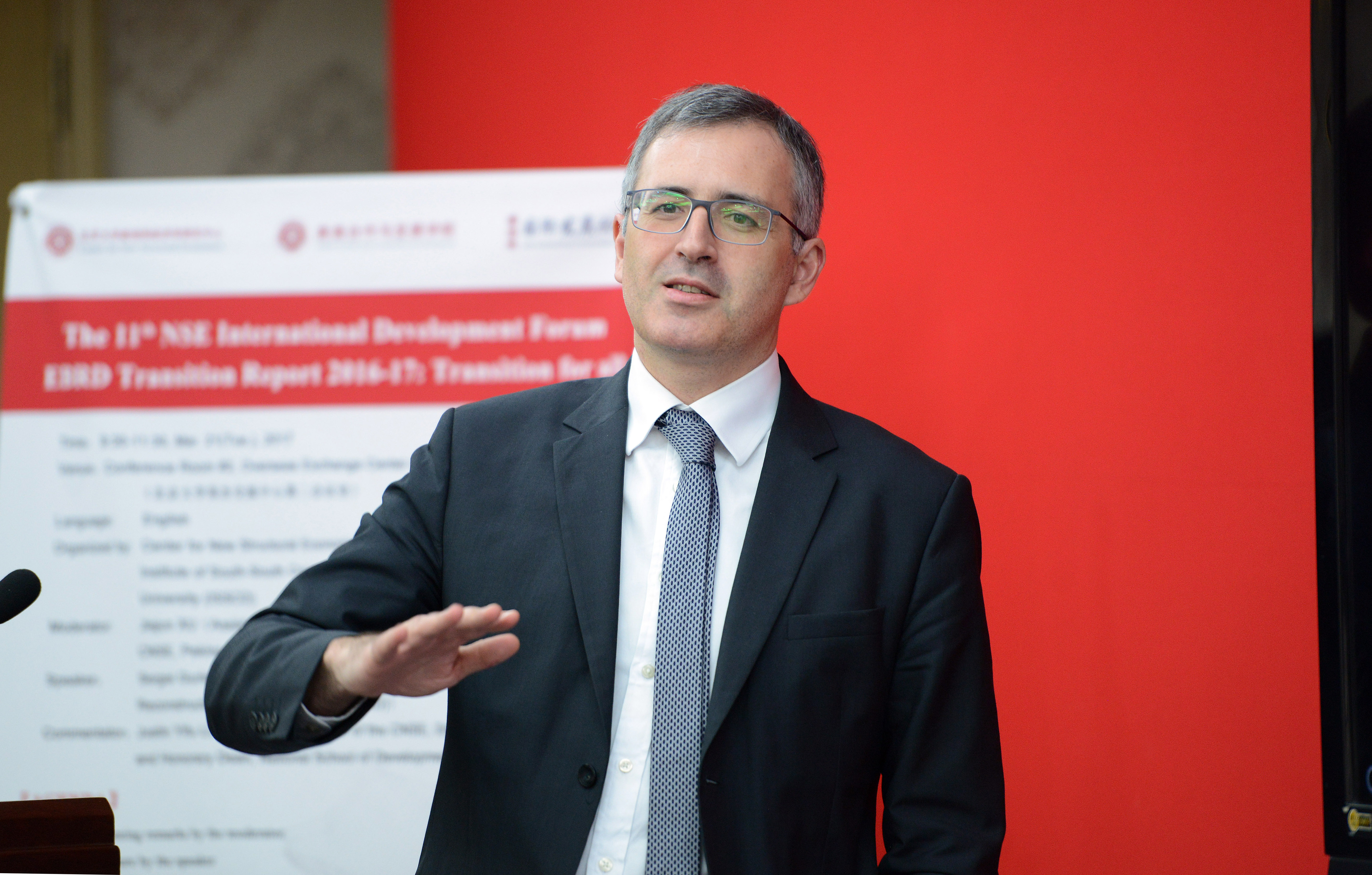 Prof. Sergei Guriev, Chief Economist of the European Bank for Reconstruction and Development (EBRD), highlighted the EBRD’s focus on inequality and economic inclusion in its new Transition Report 2016-17, on the 11th New Structural Economics International Development Forum, organized by the Center for New Structural Economics (CNSE) and the Institute of South-South Cooperation and Development at Peking University (ISSCD) on March 21, 2017. Dr. Jiajun Xu, Executive Deputy Director of the CNSE, hosted the forum.