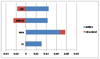 However, if we look at growth experience elsewhere in the world, we find structural change is too often growth-reducing. The following figure shows the results for different areas for the 1990-2005 period. We decompose growth into productivity growth within sectors (the blue bars) and productivity growth due to structural change (the red bars). We can see in Asia, the within-sector and structural change productivity growth are both positive. In Latin America andAfrica, the structural-change component is negative. It indicates that in the latter regions labor is moving from high productivity to low productivity sectors.