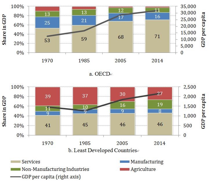 Concerns about the future of manufacturing as a viable source of economic growth have been investigated empirically by Hausmann, et al. (2011) with a measure of the sophistication of an economy based on how many products a country exports successfully and how many other countries also export those products. The results are striking: over 70 percent of the income variations among nations can still be explained by differences in manufactured product export data alone (Hausman et al. 2011). The analysis of the composition and quantity of a nation’s manufacturing reveals that sophisticated economies export a large variety of “exclusive” goods that few other countries can produce. To do this, these economies have typically accumulated productive knowledge and developed manufacturing capabilities that others do not have. It therefore appears that national income and economic sophistication (“economic complexity”) tend to rise in tandem. Furthremore, the linkage between manufacturing, economic complexity and prosperity is highly predictive, with economic complexity being much better at explaining the variation in incomes across nations compared to any other leading indicators. This is exemplified in Figure 3that contrasts the link between sectoral shares in GDP and income level of OECD countries with that of the least developed countries.In other words, even basic manufacturing expertise and capabilities can gradually breed new knowledge and capabilities and lead to new, more advanced products, provided that the right strategic and business decisions are made on industrial and technological upgrading. In the words of Hausmann and Hidalgo (2012, p. 13), economic development is “a social learning process, but one that is rife with pitfalls and dangers. Countries accumulate productive knowledge by developing the capacity to make a larger variety of products of increasing complexity. This process involves trial and error. It is a risky journey in search of the possible. Entrepreneurs, investors and policy-makers play a fundamental role in this economic exploration. Manufacturing, however, provides a ladder in which the rungs are more conveniently placed, making progress potentially easier.” In sum, manufacturing still generates economies of scale, sparks industrial and technological upgrading, fosters innovation, and has big multiplier effects.