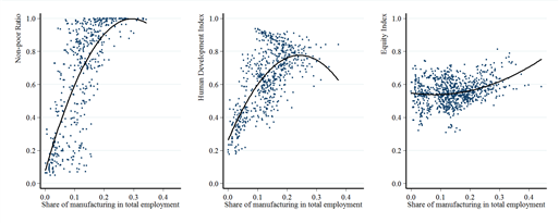 Industrialization also promotes inclusive development by expanding the fiscal space for social investments. In such a context fiscal revenues are likely to increase due to: i) exports of higher value added, ii) rising profits of companies and iii) better incomes earned by more productive and innovation labor force.[5]Figure 1illustrates the positive relationship between the level of industrialization (horizontal axis) and a number of measures of social inclusiveness such as the non-poor ratio, the HDI and the inverse of the Gini coefficient.