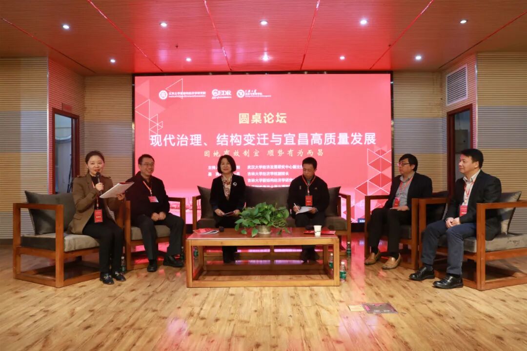 主旨演讲后是圆桌论坛环节,由武汉大学经济发展研究中心副主任罗知教授主持,五位专家学者参与,分别是吉林大学经济学院副院长、吉林大学新结构经济学研究中心副主仁丁一兵教授,中南财经政法大学文澜学院院长、中南财经政法大学新结构经济学研究中心主任龚强教授,宜昌市人民政府副市长、武汉大学教授李燕萍,武汉大学经济发展研究中心主任叶初升教授,以及湖北兴发化工集团党委副书记易行国。五位学者就“现代治理变迁,宜昌高质量发展”为主题展开论述。大家一致认为要把绿色环保的意识加强到创新创业中,培养绿色环保的高新科技企业。新结构经济学强调禀赋结构,有效市场和有为政府,当禀赋条件发生变化的时候,需要政府在这个过程中发挥这个市场在利润的引导下实现结构变迁的内在动力。现场老师和学生也进行了热烈的互动,学术氛围浓厚。