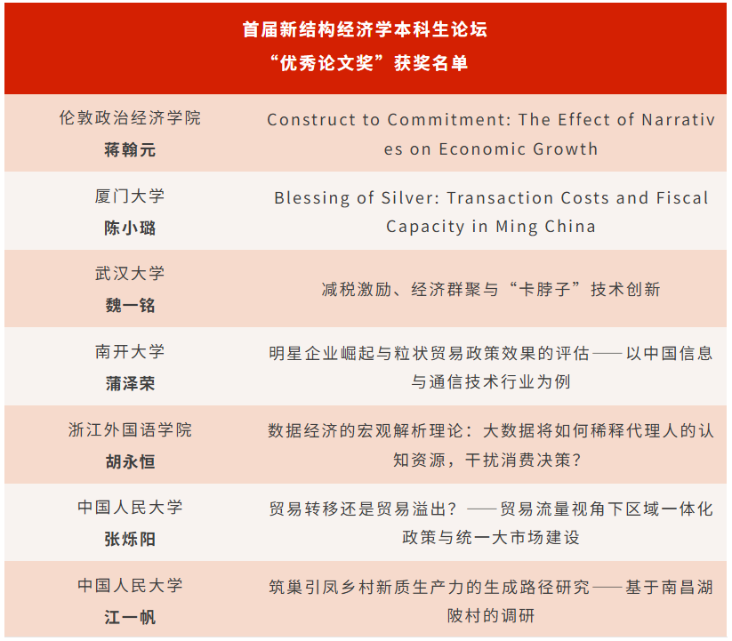 在全场师生热烈的掌声中,首届新结构经济学本科生论坛圆满落下帷幕。此次论坛不仅为青年学子搭建了高水平的学术交流平台,也为新结构经济学理论发展与实践应用注入了青春活力,期待未来更多青年力量投身新结构经济学研究,立足中国经济实践,深化理论创新,在构建中国自主经济学理论创新的进程中贡献青春力量。