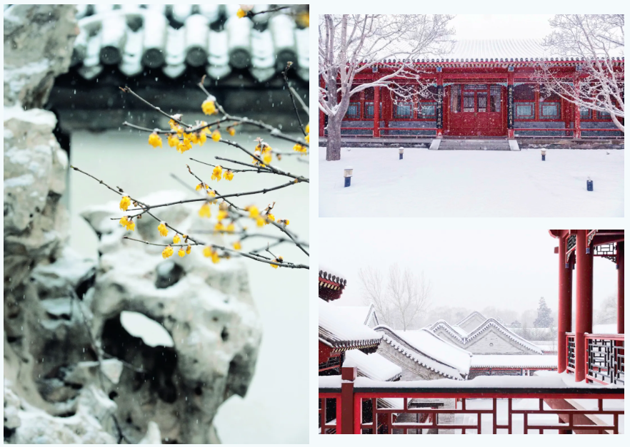 雪落无声时,暗香浮动的腊梅让朗润园显露出水墨本相,镜头透过花格窗望去,整个世界都成了裱在雪框里的古画。