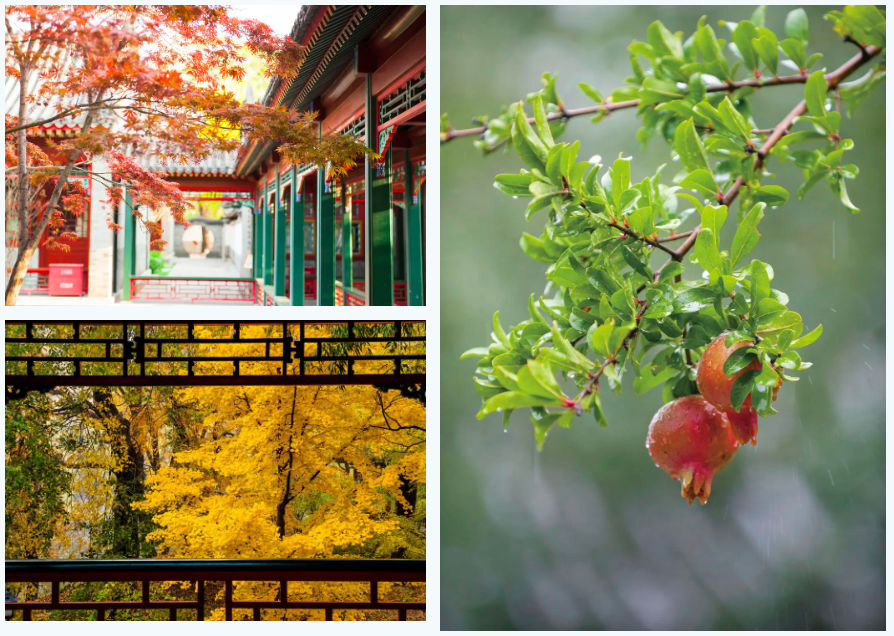 当银杏铺开鎏金地毯,满树的红红石榴,飞檐斗拱交织成了托举晚霞的印照。秋阳穿过棂花窗格的瞬间,在照片上烙下斑驳的时光密码。