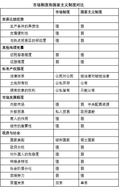 美索不达米亚、古希腊属于城邦国家,拥有市场制度。美索不达米亚的大部分历史都是由城邦组成的;南北生产条件的异质性(农产品与奢侈品、青铜、石头和木材)有利于城邦间贸易发展(内部贸易);存在土地和奴隶市场;法律规定公民之间的关系,尤其是私有财产的关系;个人渴望拥有大量私有土地。古希腊和美索不达米亚很像,贸易优势明显,难以征服,容易逃税,社会阶层分化程度高,公民拥有世袭权利并参与政治等。