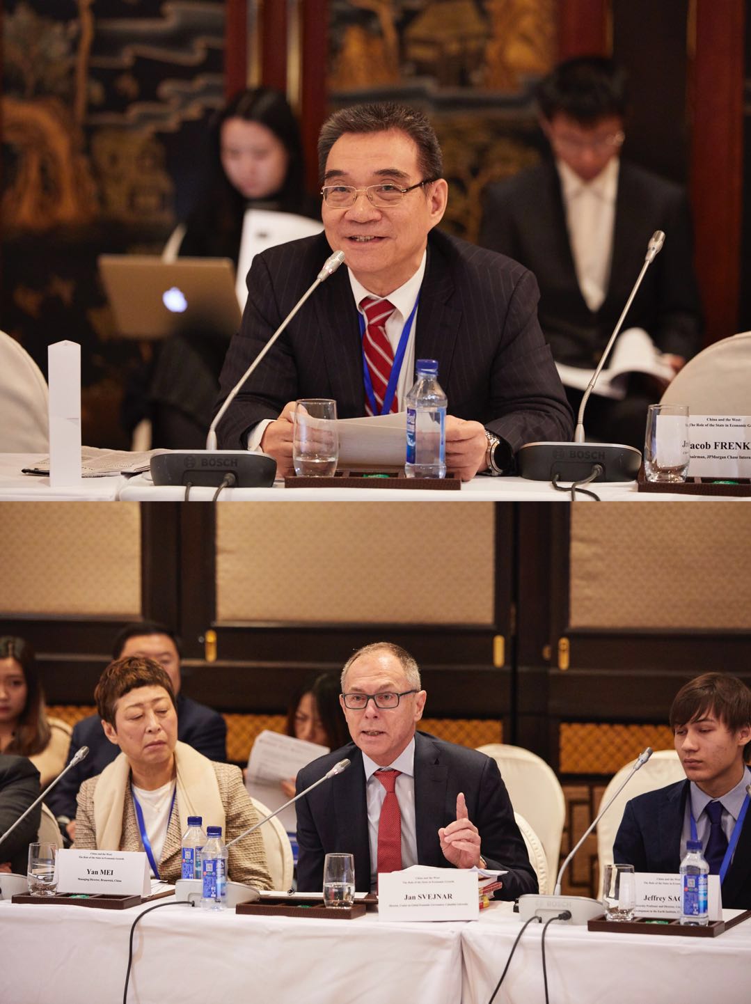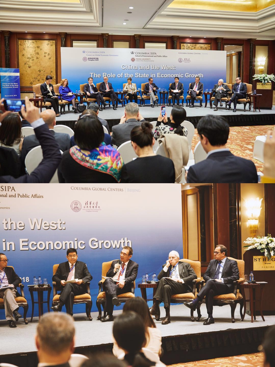 哥伦比亚大学国际与公共事务学院院长玛丽特?杰诺教授、哥伦比亚大学国际与公共事务学院James T. Shotwell国际政治经济讲席教授、全球经济治理中心主任扬?什韦纳尔教授、南海控股有限公司董事会主席、中国与西方对话论坛联合创始人于品海博士、北京大学新结构经济学研究院院长林毅夫教授、清华大学经济管理学院院长钱颖一教授做欢迎致辞。2001年诺贝尔经济学奖得主、哥伦比亚大学教授约瑟夫?斯蒂格利茨教授、2006年诺贝尔经济学奖得主、哥伦比亚大学资本主义与社会中心主任埃德蒙?菲尔普斯教授、中国人民银行行长易纲博士、前美国财务部部长、哥伦比亚大学国际与公共事务学院客座教授杰克?卢教授、哈佛大学George F. Baker经济学教授马丁?费尔德斯坦教授、复旦大学中国社会主义市场经济研究中心主任张军教授、清华大学国家金融研究院院长朱民教授、清华大学经管学院弗里曼经济学讲席教授、常务副院长白重恩教授、清华大学中国与世界经济研究中心主任李稻葵教授、北京大学国家发展研究院教授、中国宏观经济研究中心主任卢锋教授、北京大学国家发展研究院陈平教授、北京大学新结构经济学研究院学术副院长王勇副教授、中国国际金融有限公司前首席执行官朱云来博士、摩根大通国际董事长、三十国集团董事会主席雅克布?弗伦克尔博士、中国开发银行首席经济学家刘勇博士、世界贸易组织首席经济学家罗伯特?库普曼博士、欧洲投资银行主席经济学家兼研究部门主任黛博拉?雷沃尔泰拉博士、国际货币基金组织副总裁张涛博士等60多名来自世界顶尖院校的诺贝尔经济学奖得主、权威经济学家、高级研究学者、政策制定者和商界领袖汇聚一堂,审视当今中国和西方政府在世界舞台中担当的角色,同时对中国、美国、欧盟三个全球主要经济体的发展战略和政策进行深入讨论。