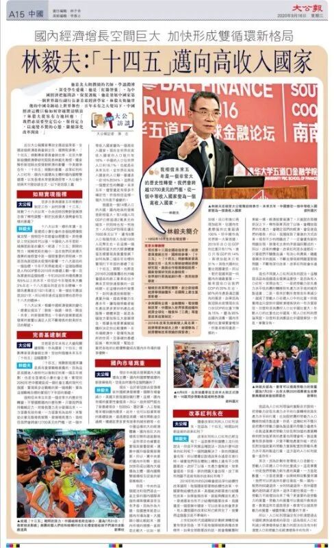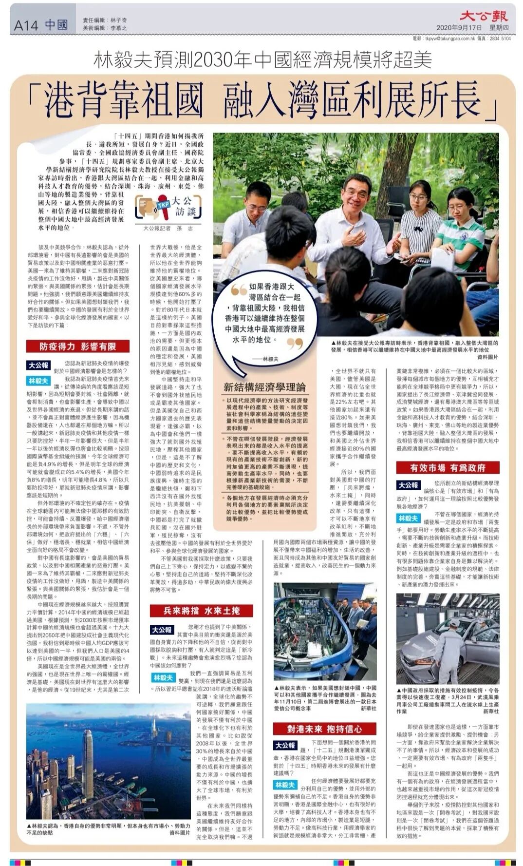 近日,大公报-大公网记者孙志独家专访全国政协常委、全国政协经济委员会副主任、国务院参事,“十四五规划”专家委员会副主席、北京大学新结构经济学研究院院长林毅夫教授,独家解析新冠肺炎疫情对经济的影响、中美竞争合作、“十四五”规划的要义、改革红利和人口红利、国内大循环为主体和国内国际双循环,以及香港未来发展路径等。