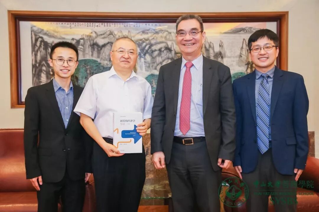 由左至右依次:张一林副教授、李善民副校长、林毅夫院长、王勇副院长