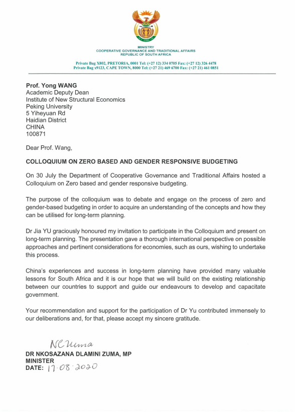 2020年7月30日,我院国际发展合作部主任于佳博士应南非政府与经济日报社驻南非记者站邀请,作为中方专家在南非“零基和性别敏感预算”部长级研讨会上介绍中国政府推进经济社会发展目标、制定与执行五年规划的经验,获得高度评价。日前,南非联合执政与传统事务部部长德拉米尼-祖马与经济日报社分别向我院致函表示感谢,高度评价了于佳博士的发言内容。