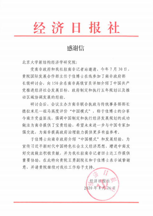 日前,南非联合执政与传统事务部部长德拉米尼-祖马与经济日报社分别向我院致感谢函,高度评价了于佳博士的发言内容。德拉米尼-祖马部长表示,于佳博士的分享令南方受益匪浅,中国制定和执行经济发展规划的成功做法“为南非提供了宝贵经验,希望未来进一步与中国专家加强合作,为南非提高政府治理能力提供更多有益参考”。经济日报社则表示,于佳博士的发言“为宣传习近平新时代中国特色社会主义经济思想、增进中南友好交流做出了积极贡献”。
