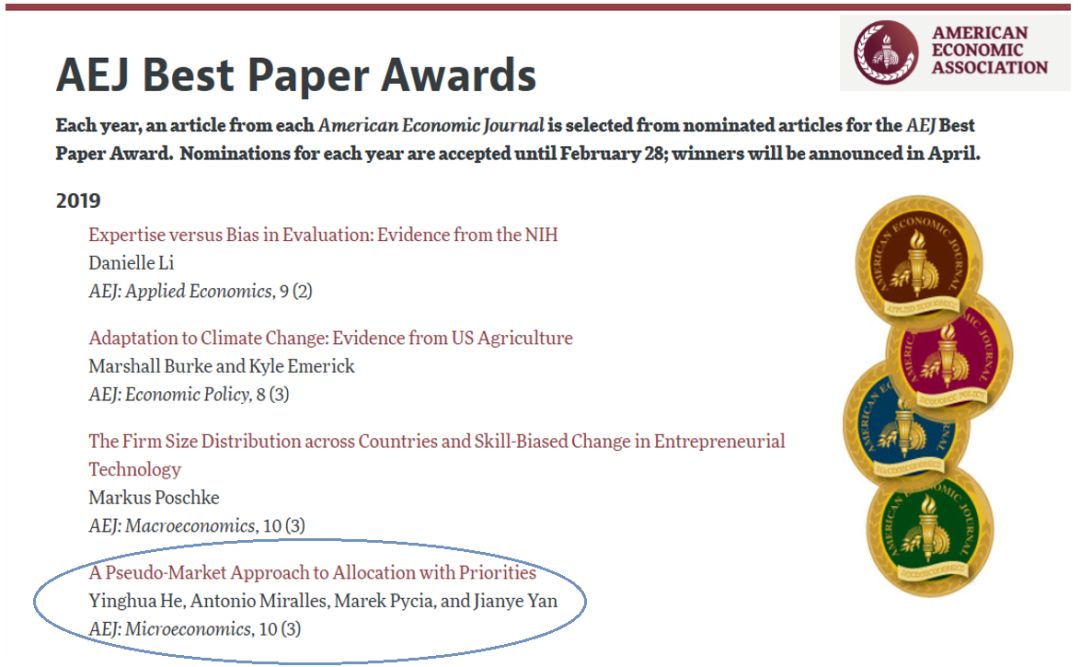 美国经济协会(American Economic Association)会刊之一American Economic Journal: Microeconomics近日公布北京大学国家发展研究院的两位校友何英华(现为美国Rice University助理教授)、颜建晔(现为北京大学新结构经济学研究院副教授)发表在该刊的合作论文“A Pseudo-Market Approach to Allocation with Priorities”获得2019 AEJ最佳论文奖。